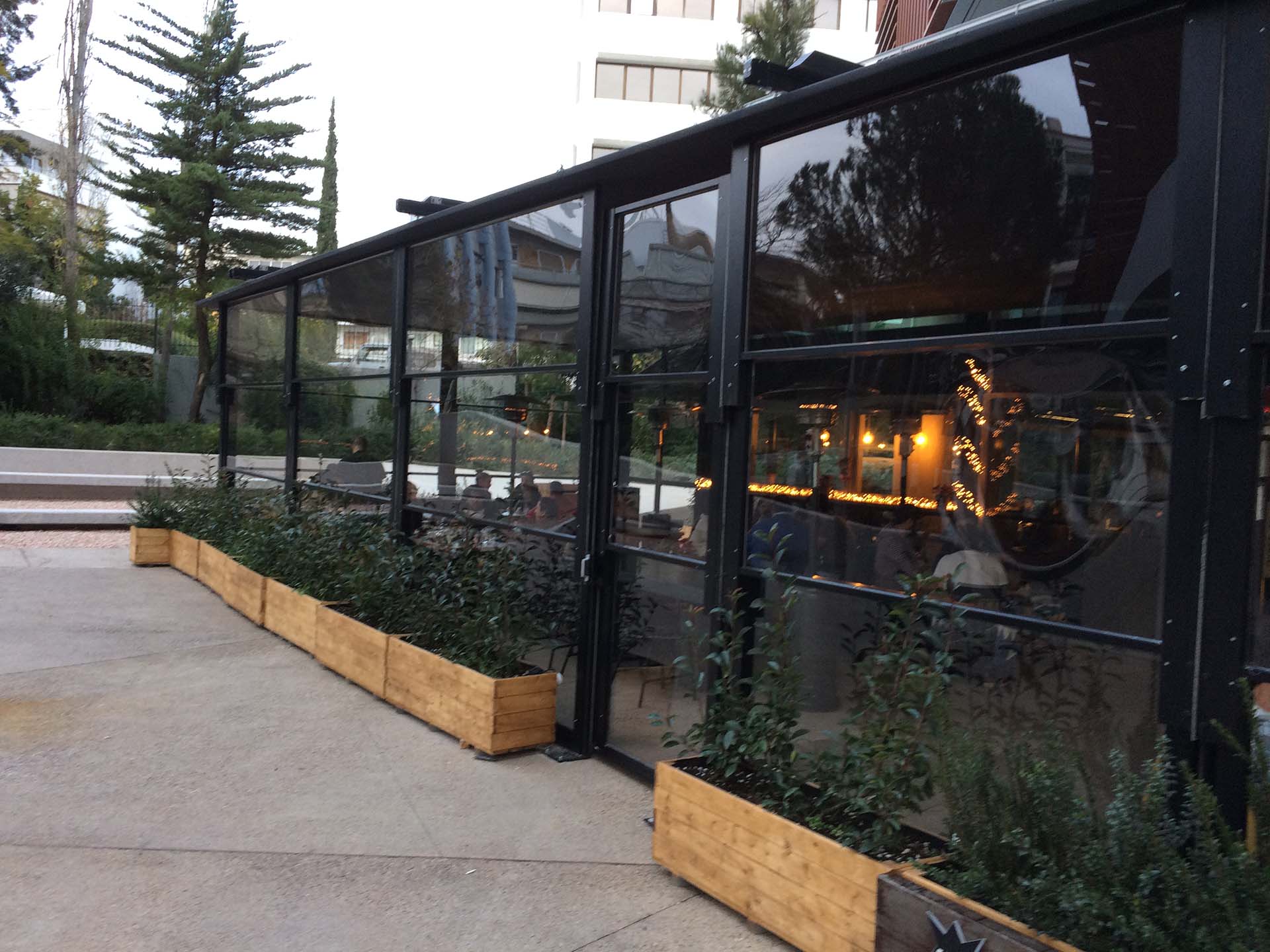 Περιμετρικό κλείσιμο με τζάμια ανασυρόμενα τύπου Ήφαιστος και πόρτα ανοιγόμενη Ήφαιστος (περισσότερα για το Σύστημα Ήφαιστος). Η κατασκευή έχει το χαρακτηριστικό πως κατασκευάζεται χωρίς κολώνες ενώ μπορεί να είναι ανοικτά ταυτόχρονα η οροφή και τα πλαϊνά τζάμια. Επίσης μετατρέπεται σε κλειστή αίθουσα.