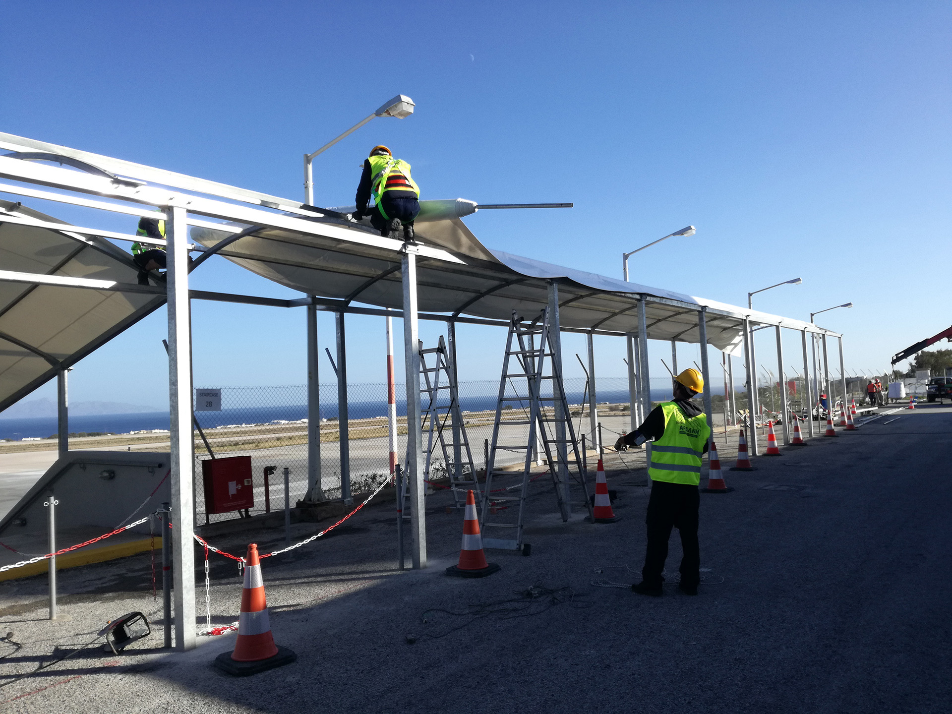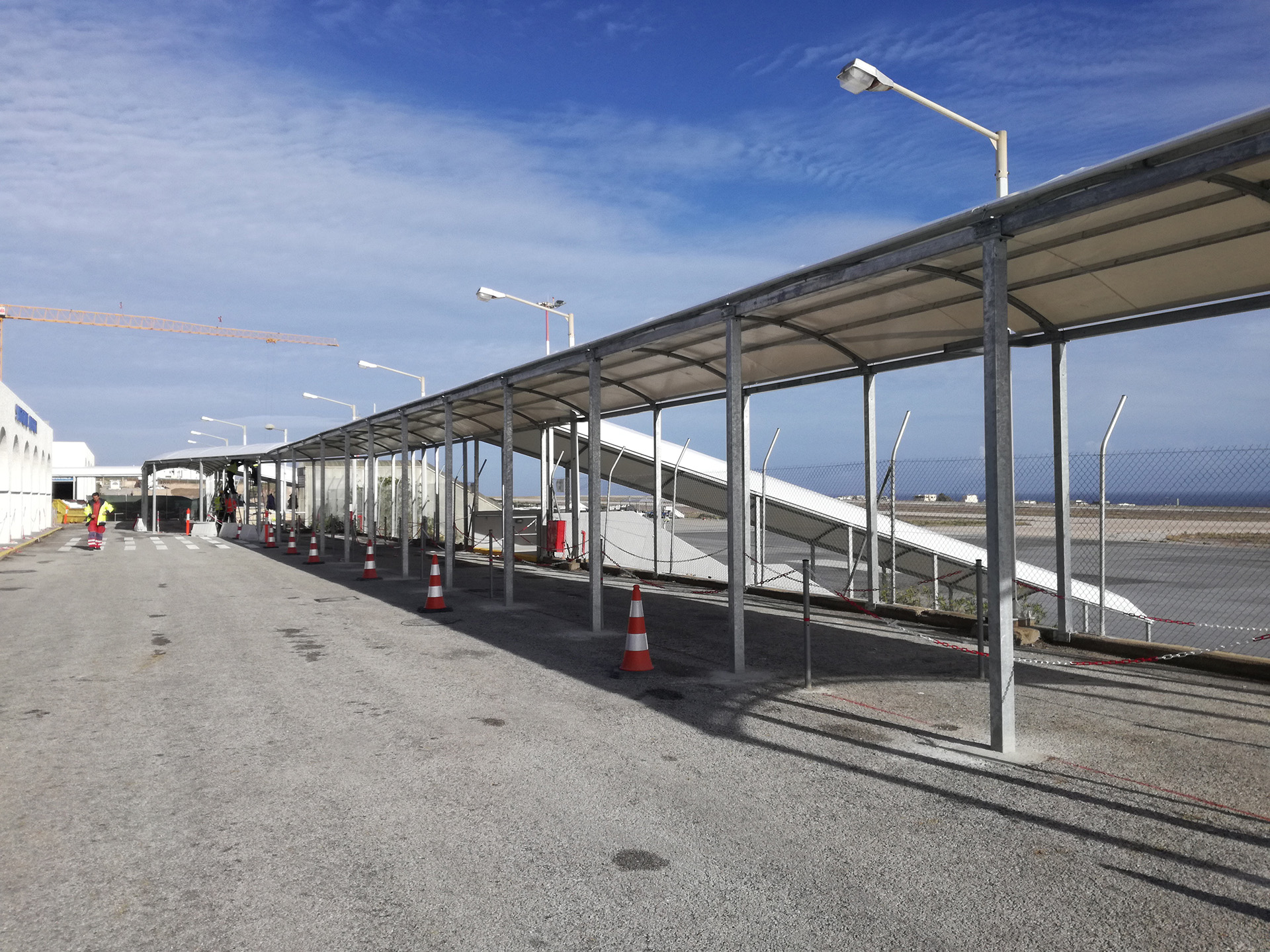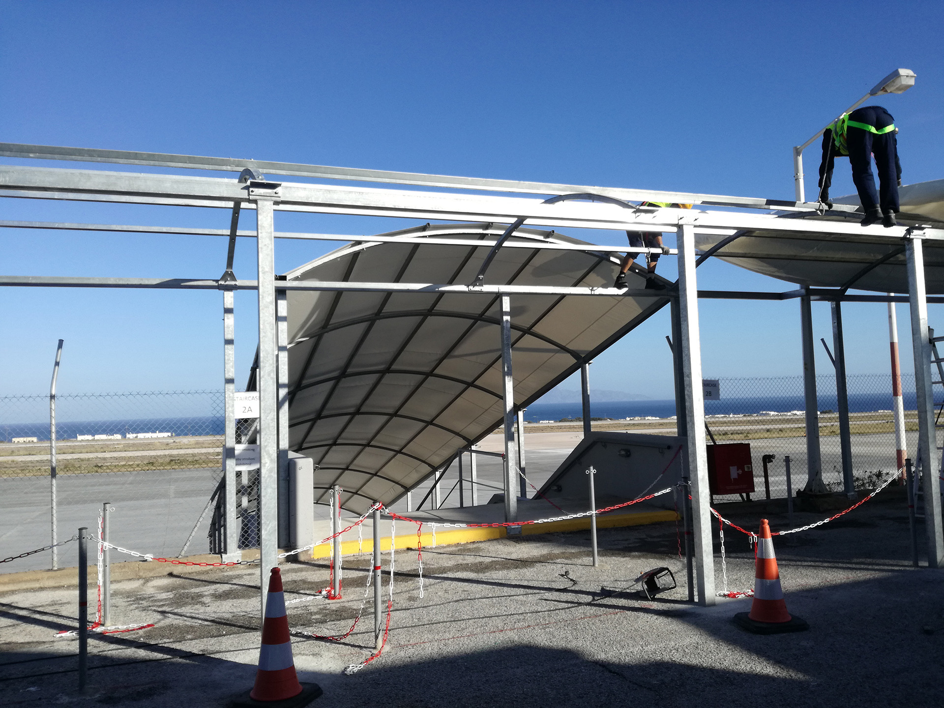 Κατασκευή και τοποθέτηση μεταλλικού υπόστεγου με τέντα για τη σκίαση και προστασία από τη βροχή στον υπαίθριο χώρο του αερολιμένα.