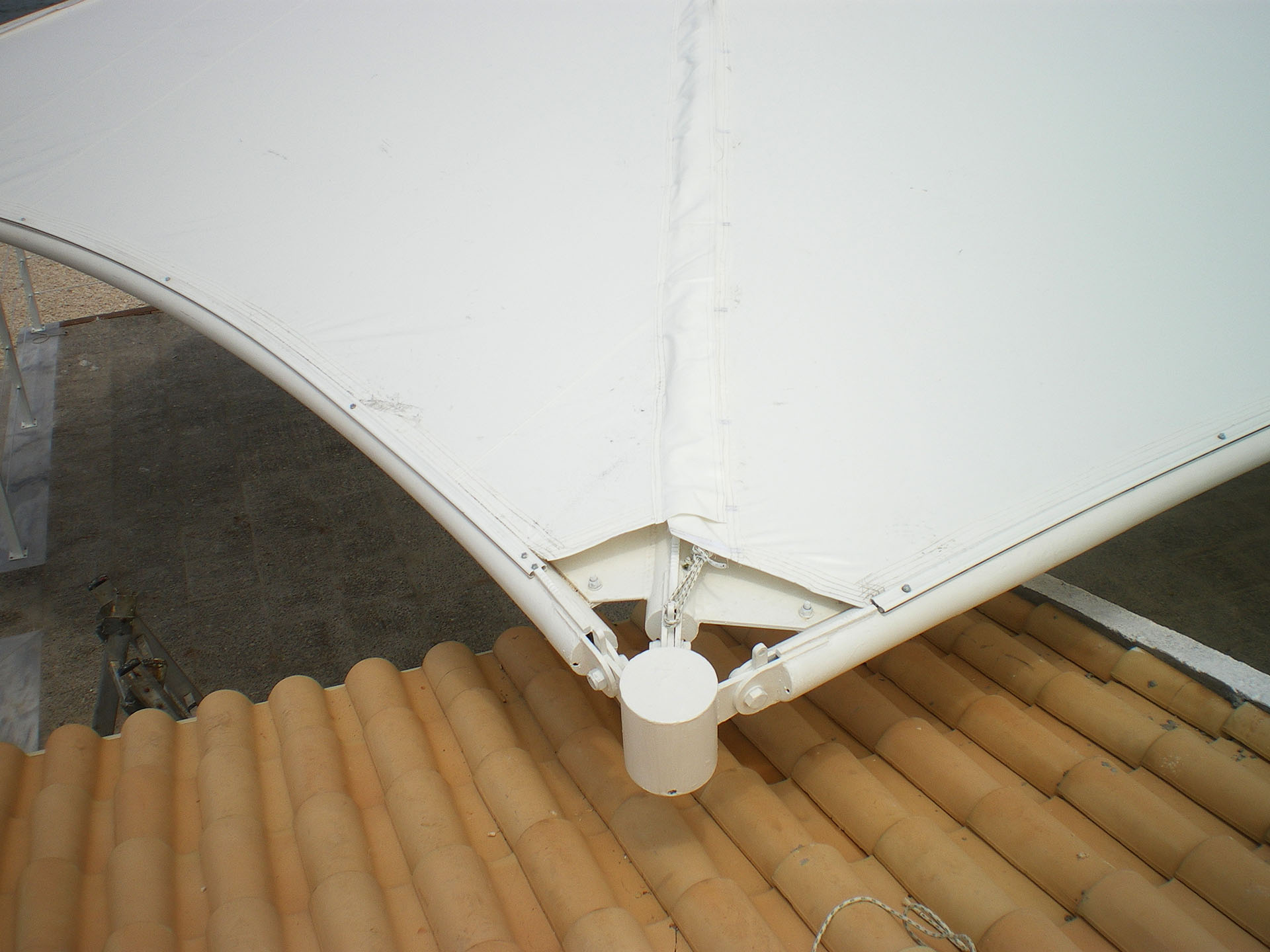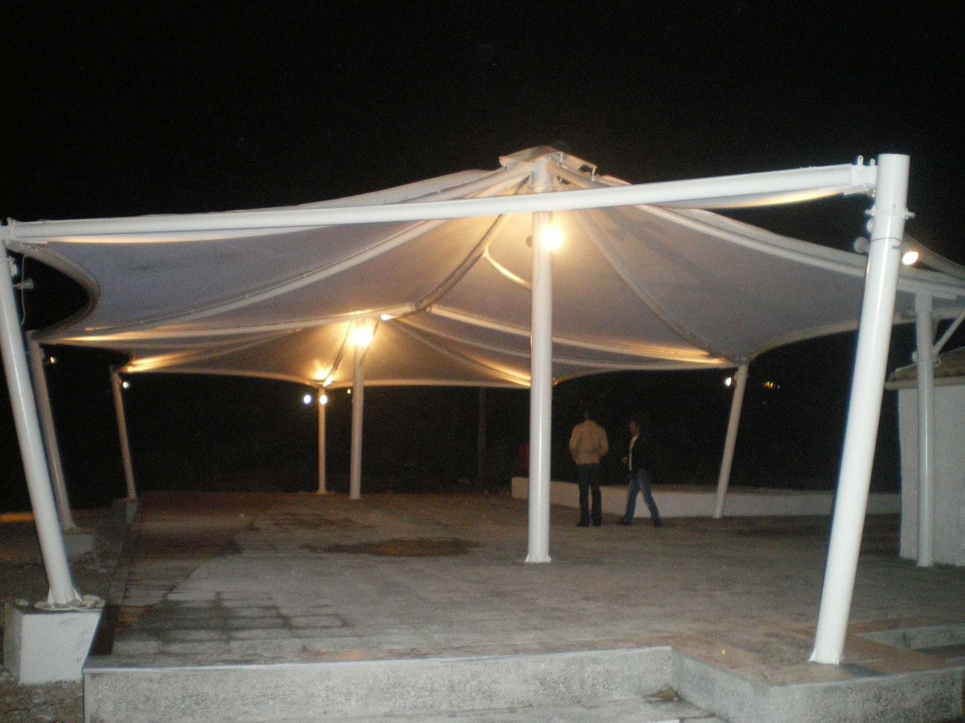 Σταθερό στέγαστρο συναρμολογούμενο και κατασκευασμένο βάση αρχιτεκτονικής μελέτης σε ξενοδοχείο της Ρόδου. Η διάστασή του είναι 25x15 μέτρα και ο σκοπός του είναι να στεγάσει το εστιατόριο και το καφέ του ξενοδοχείου.