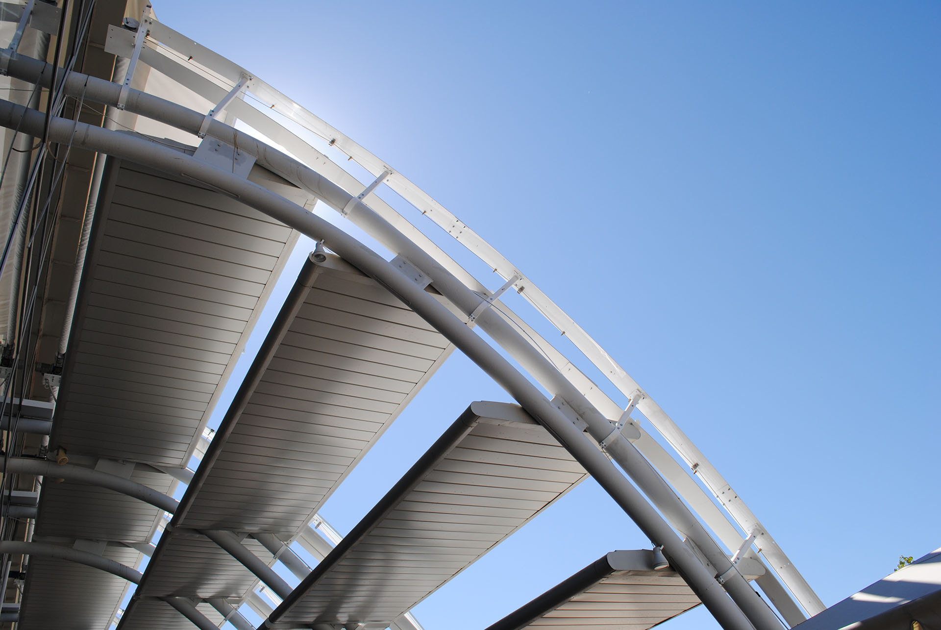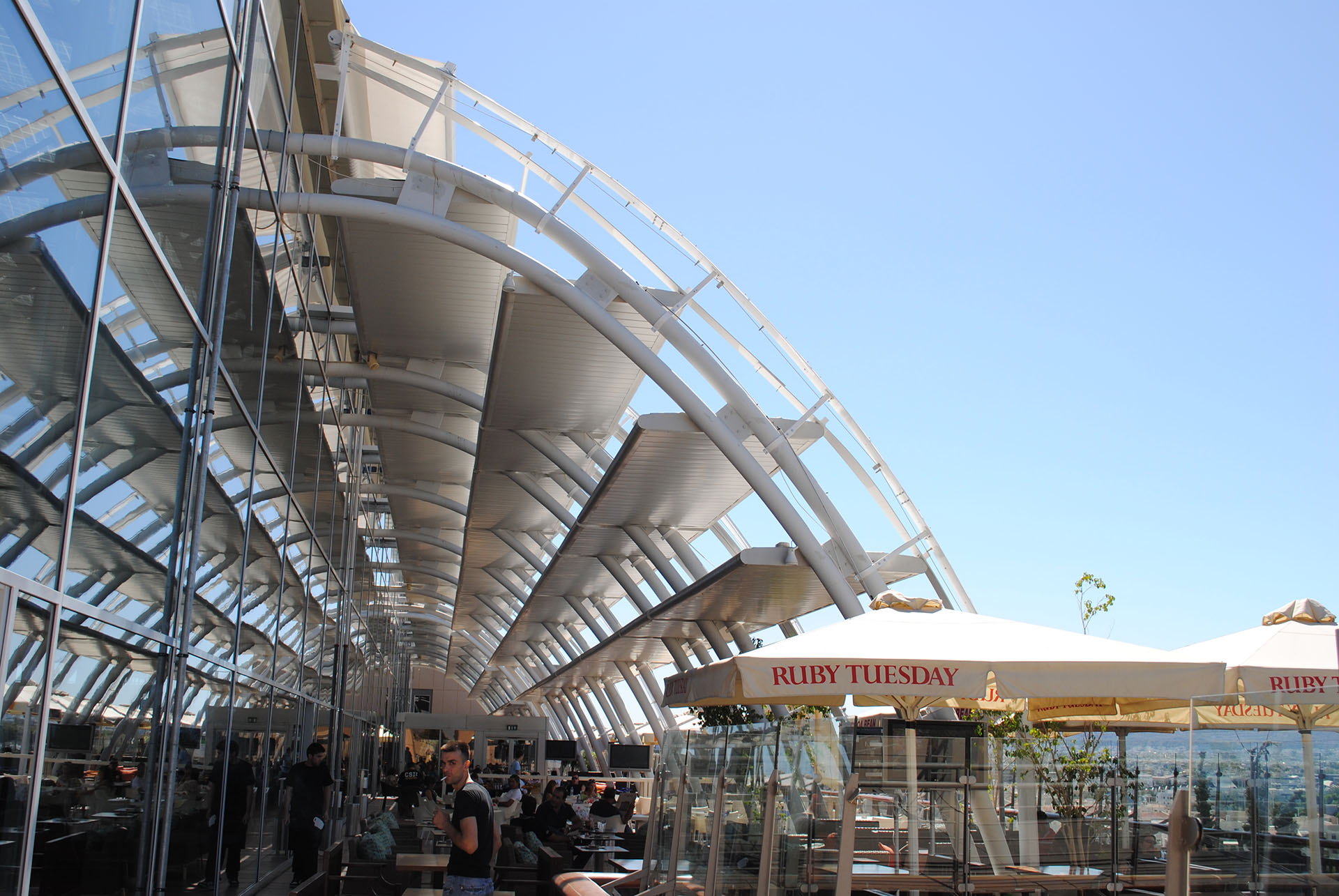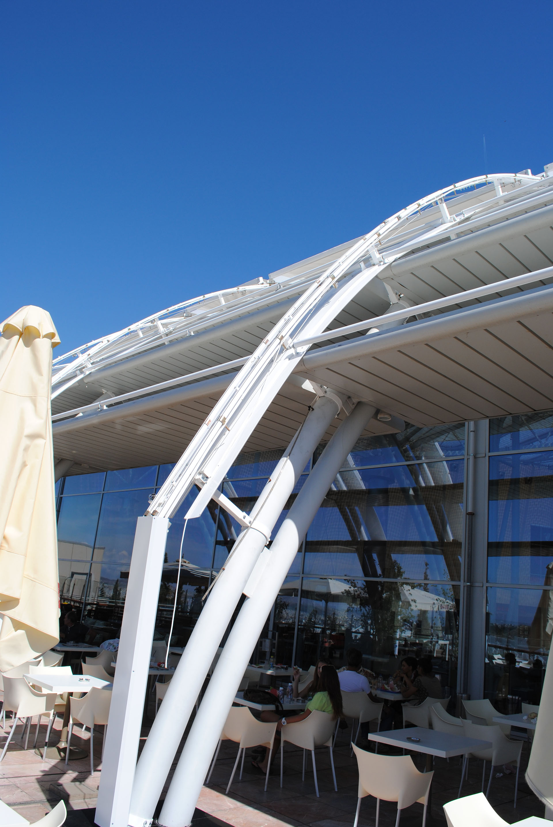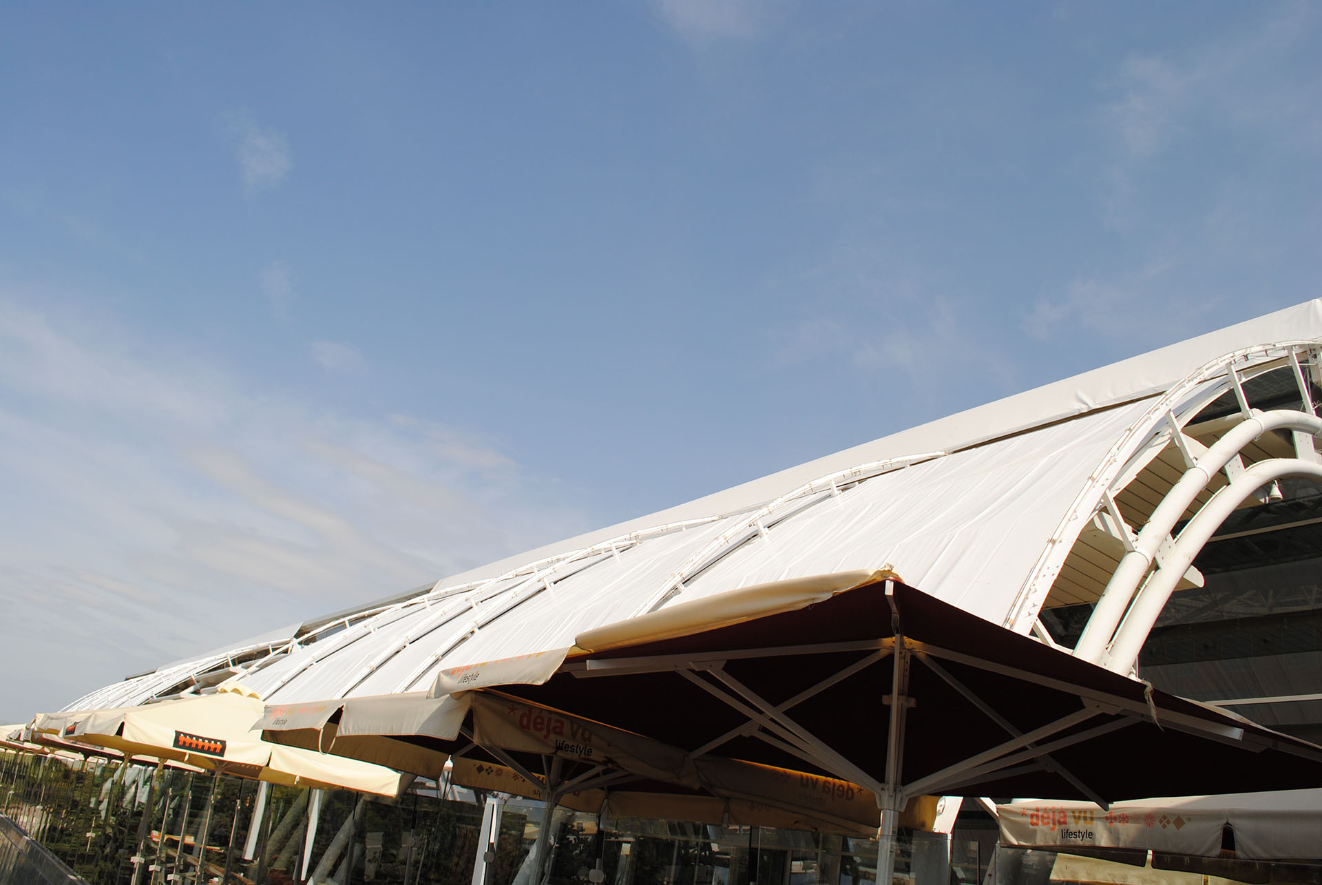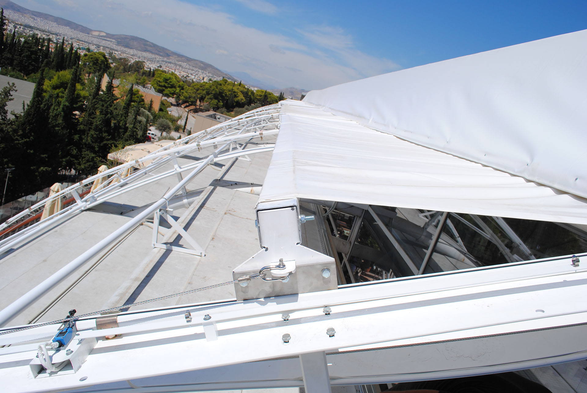 Η τέντα έχει ύψος 13μ και λειτουργεί με σύστημα προέντασης ειδικά κατασκευασμένο για το συγκεκριμένο έργο όπου οι απαιτήσεις λόγω της μεγάλης επιφάνειας είναι ιδιαίτερες. Όλη η δομή της κατασκευής είναι πατέντα η οποία κατασκευάστηκε ειδικά για το συγκεκριμένο έργο.