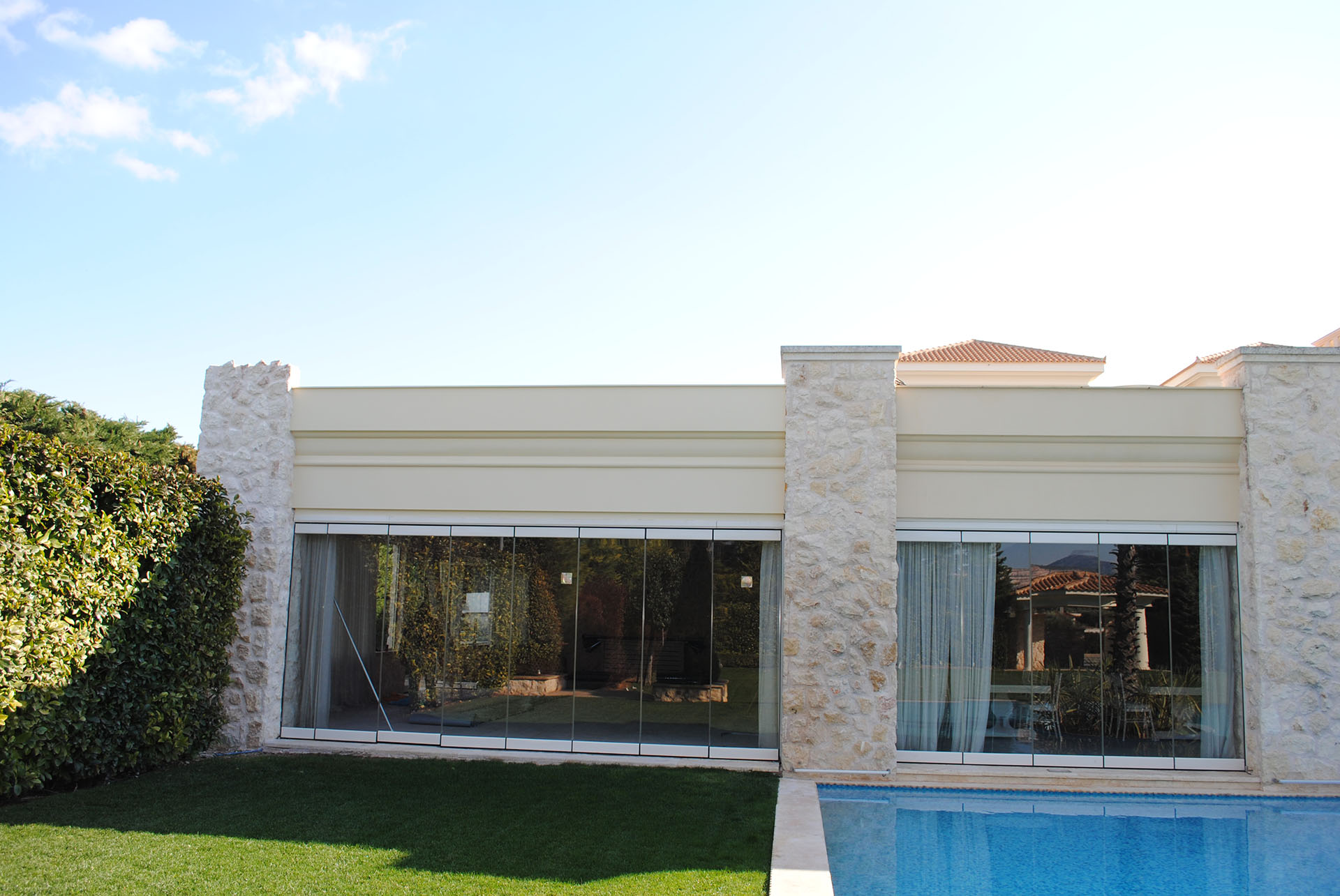 Η οροφή είναι ανοιγόμενη και διαθέτει περιμετρικό υαλοστάσιο με σταθερά και κινητά τζάμια.