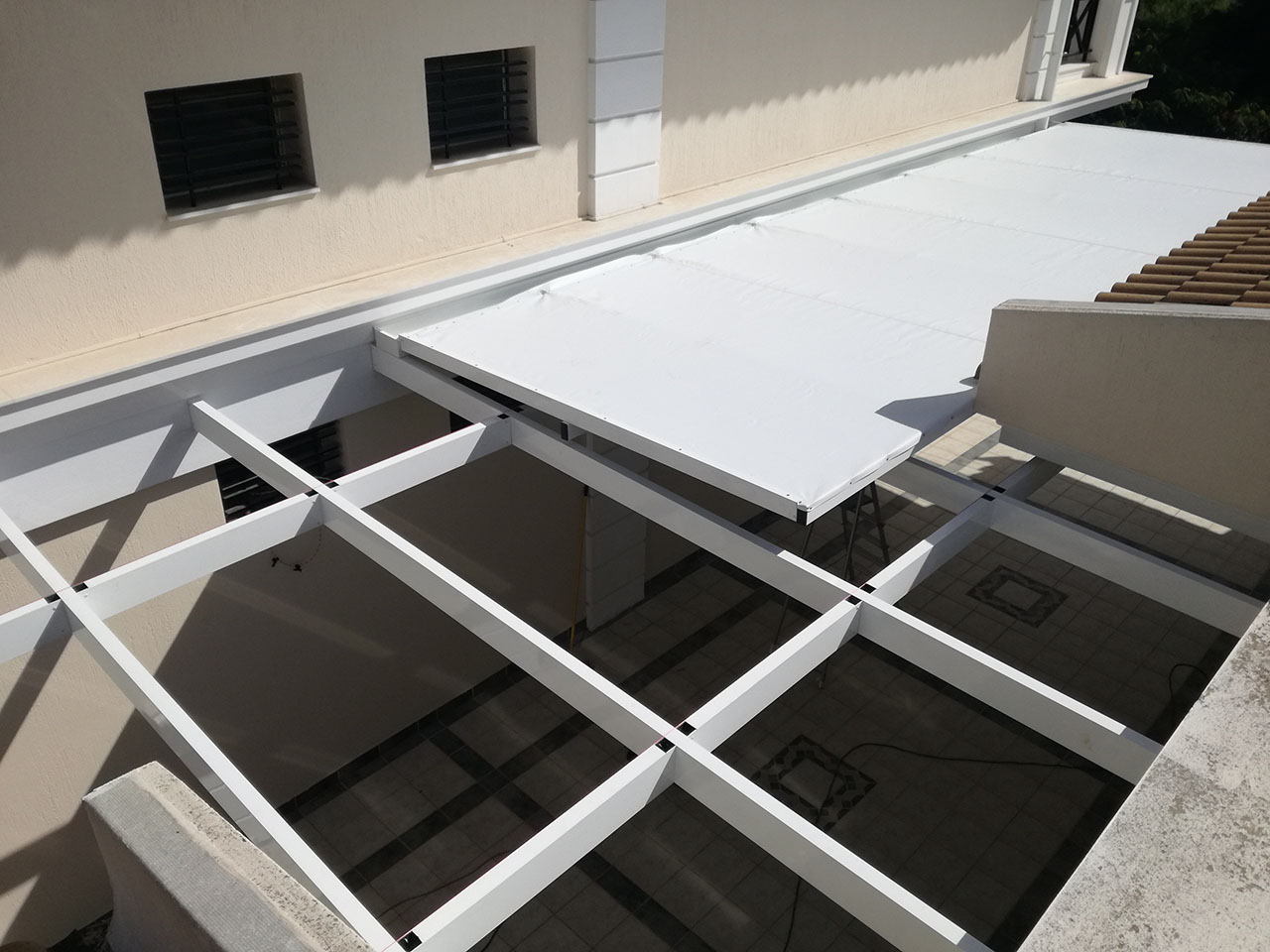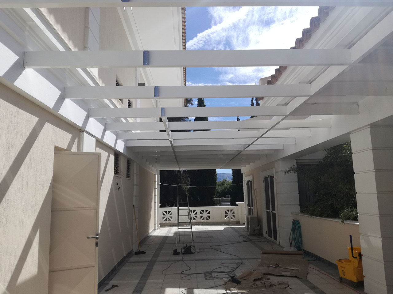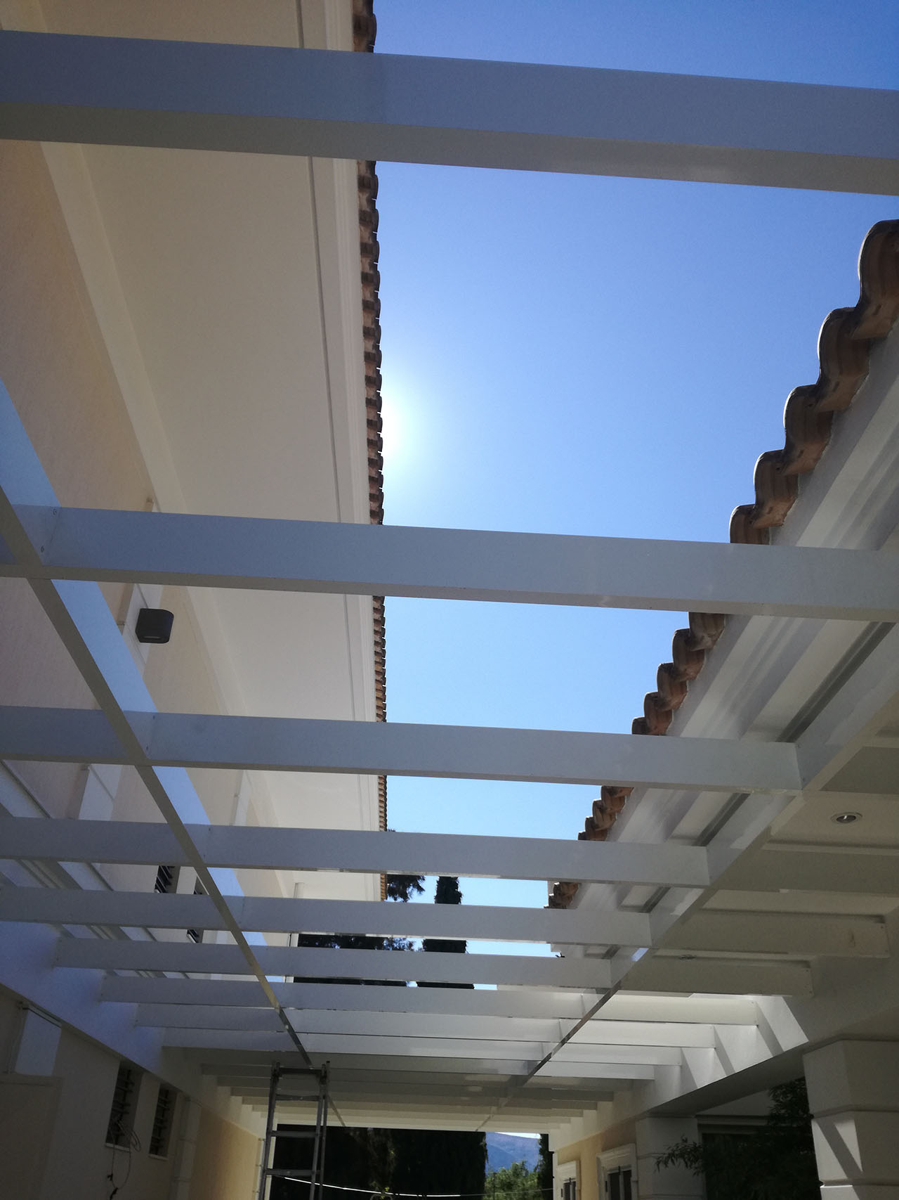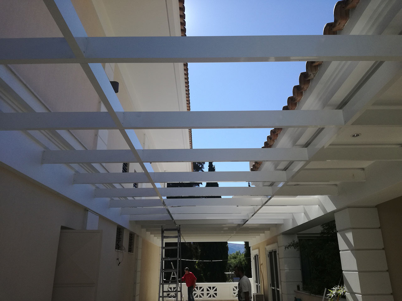Τοποθέτηση 8 μεταλλικών προφίλ σφηνοειδούς διατομής, ηλεκτροστατικά βαμμένα σε χρώμα λευκό, και εφαρμογή σε αυτά ύφασμα PVC - Block Out, λευκής απόχρωσης προκειμένου να καλυφτεί μέρος της πέργολας διαστάσεων 7,40m x 3,00m. Στο σημείο απορροής έχει τοποθετηθεί ειδικά διαμορφωμένη μεταλλική υδρορροή ηλεκτροστατικά βαμμένη σε χρώμα λευκό.