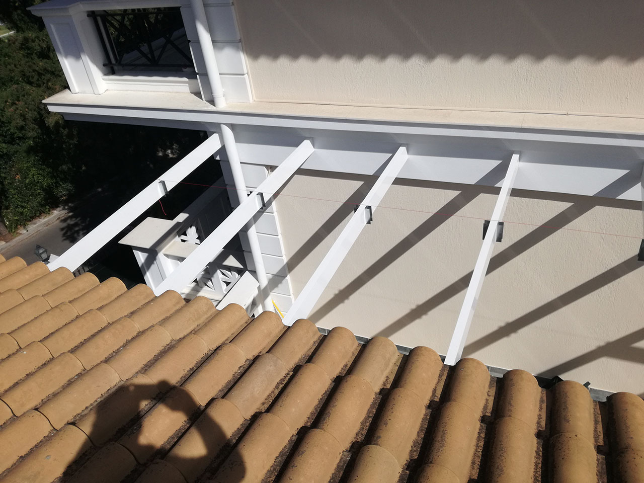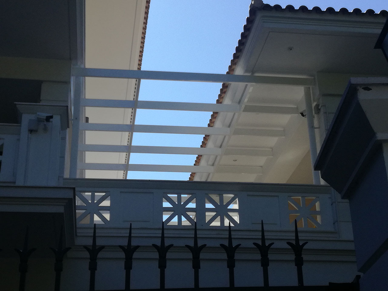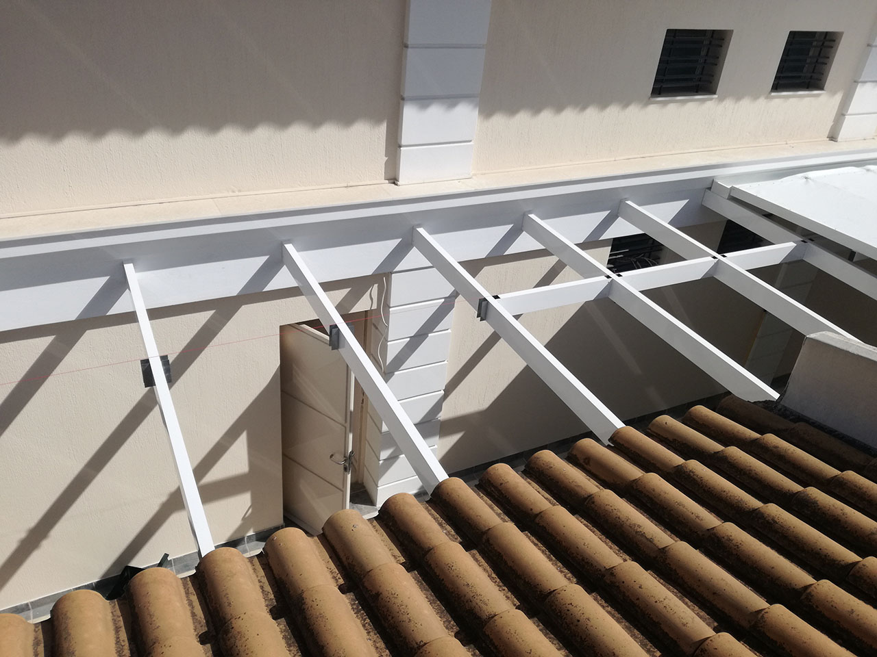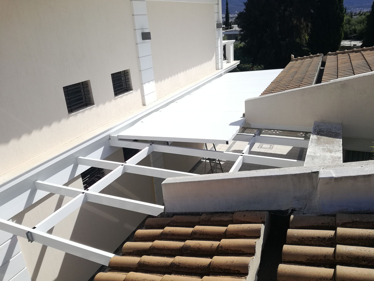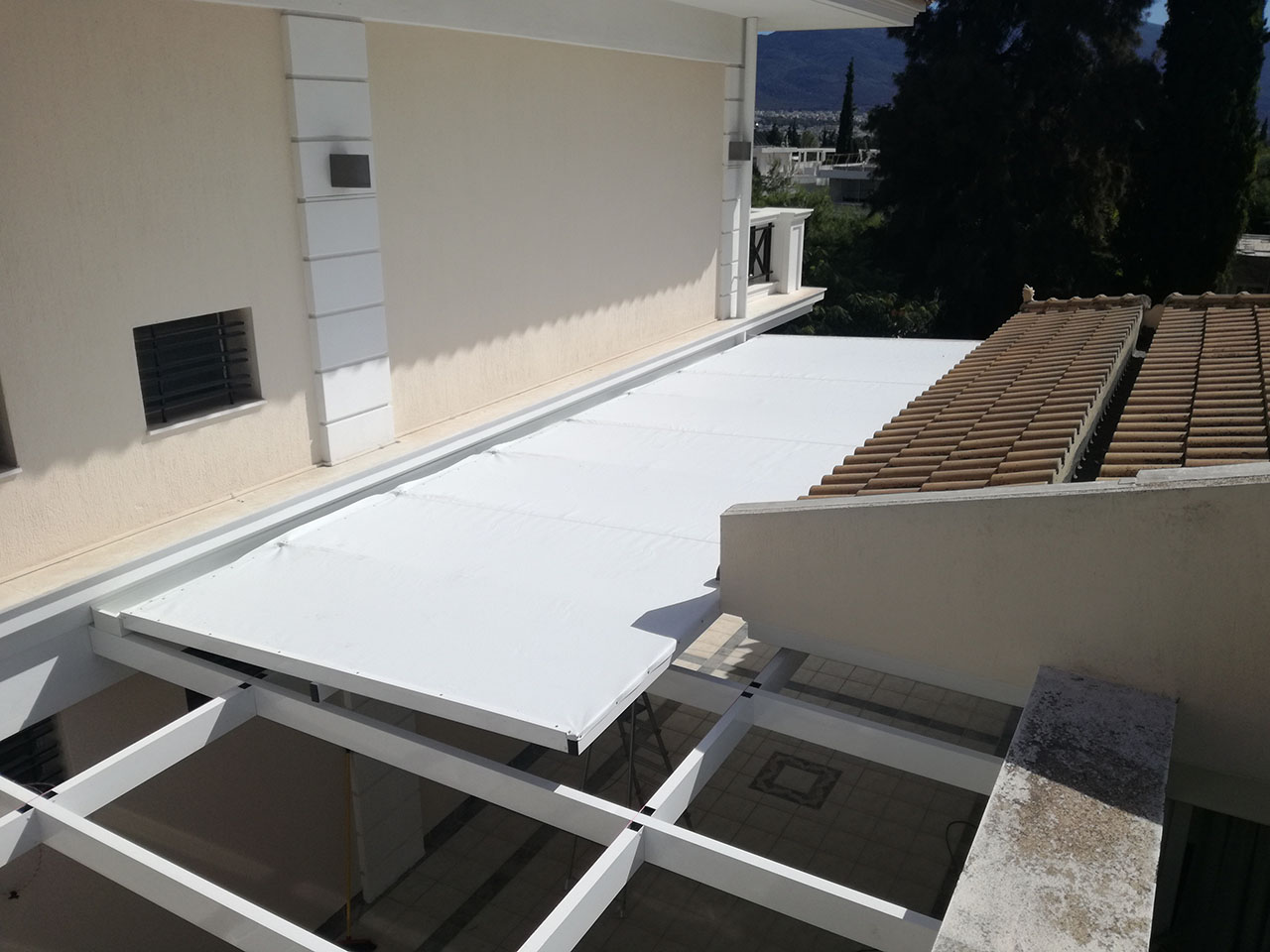 Τοποθέτηση 8 μεταλλικών προφίλ σφηνοειδούς διατομής, ηλεκτροστατικά βαμμένα σε χρώμα λευκό, και εφαρμογή σε αυτά ύφασμα PVC - Block Out, λευκής απόχρωσης προκειμένου να καλυφτεί μέρος της πέργολας διαστάσεων 7,40m x 3,00m. Στο σημείο απορροής έχει τοποθετηθεί ειδικά διαμορφωμένη μεταλλική υδρορροή ηλεκτροστατικά βαμμένη σε χρώμα λευκό.