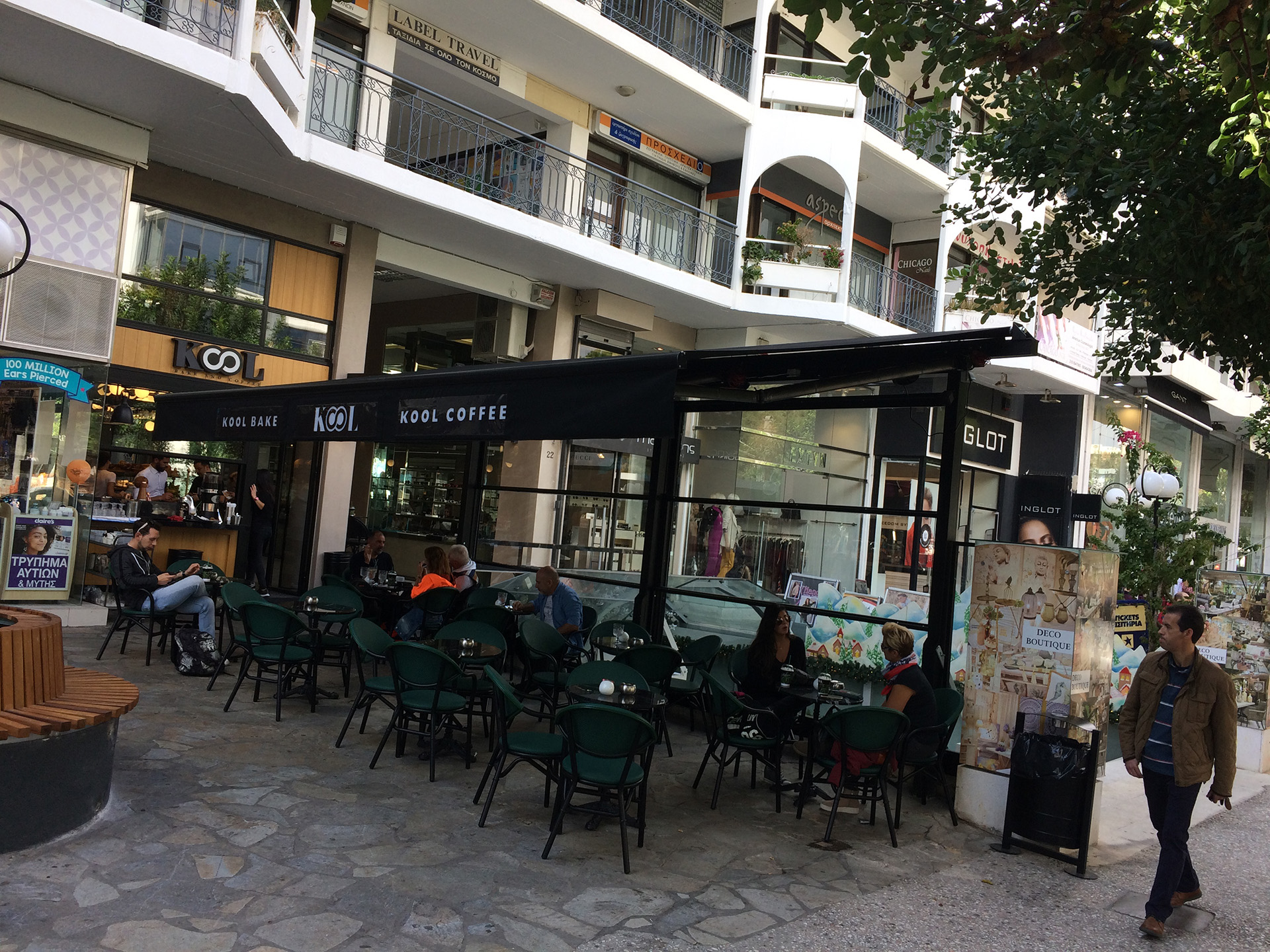 Η τέντα διαθέτει εντυπωσιακή φωτιζόμενη γλώσσα - επιγραφή για την καλύτερη προβολή της καφετέριας. Επιπρόσθετα οι ηλεκτρικά κινούμενοι ανεμοφράκτες τύπου «καρμανιόλα» παρέχουν προστασία του υπαίθριου χώρου από τον αέρα και την πλάγια βροχή.