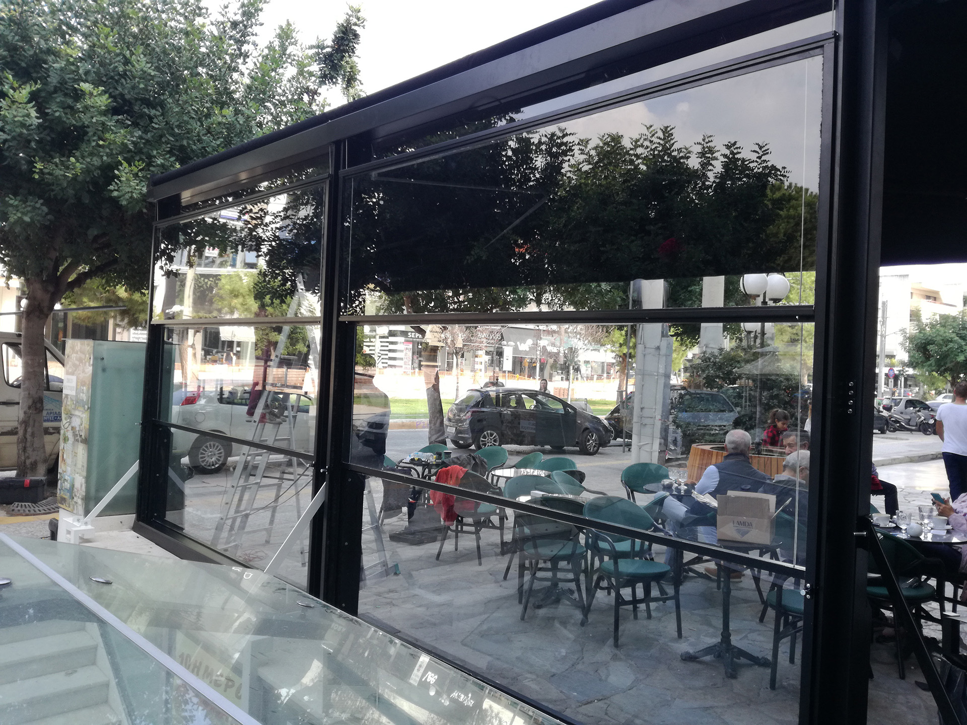 Η μεταλλική υποδομή της κατασκευής είναι ηλεκτροστατικά βαμμένη και η σκίαση του υπαίθριου τμήματος επιτυγχάνεται με την ηλεκτροκίνητη τέντα που στηρίζεται σε βραχίονες.