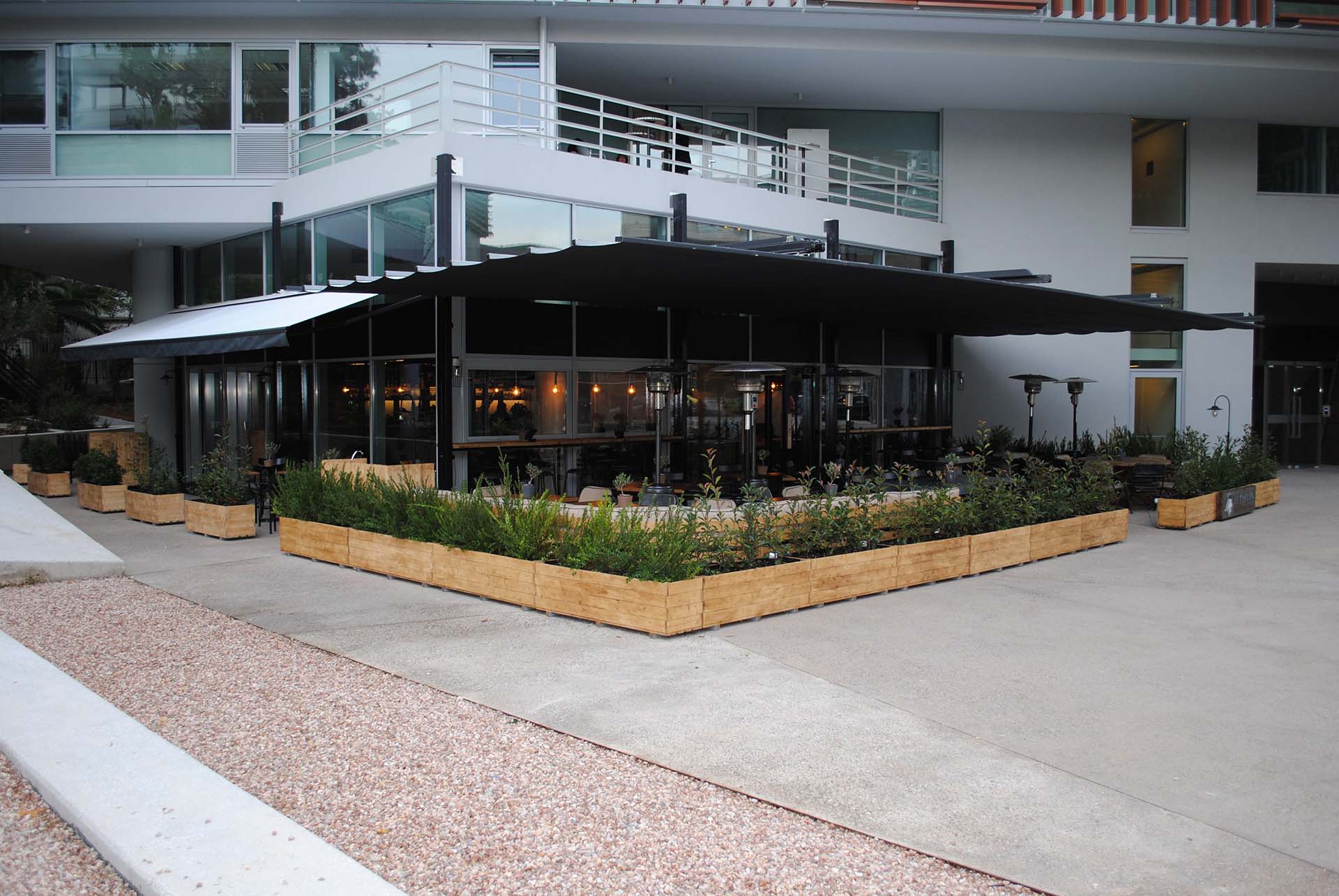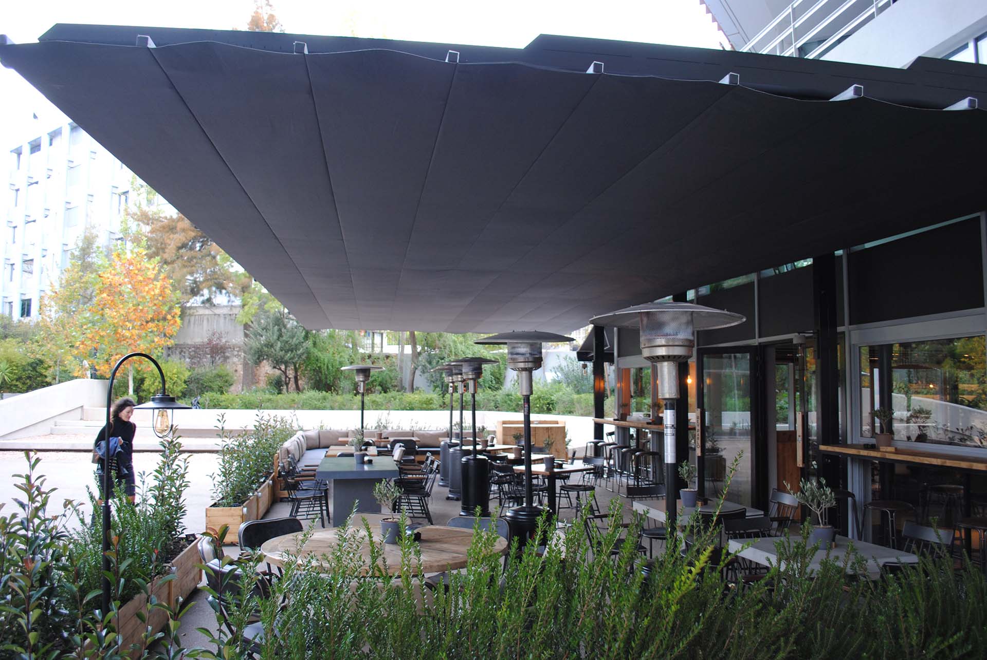 Οροφή υπαίθριου χώρου 100τμ πτυσσόμενη, χωρίς κολώνες και παντός καιρού με ελάχιστη κλίση για την απορροή των ομβρύων.