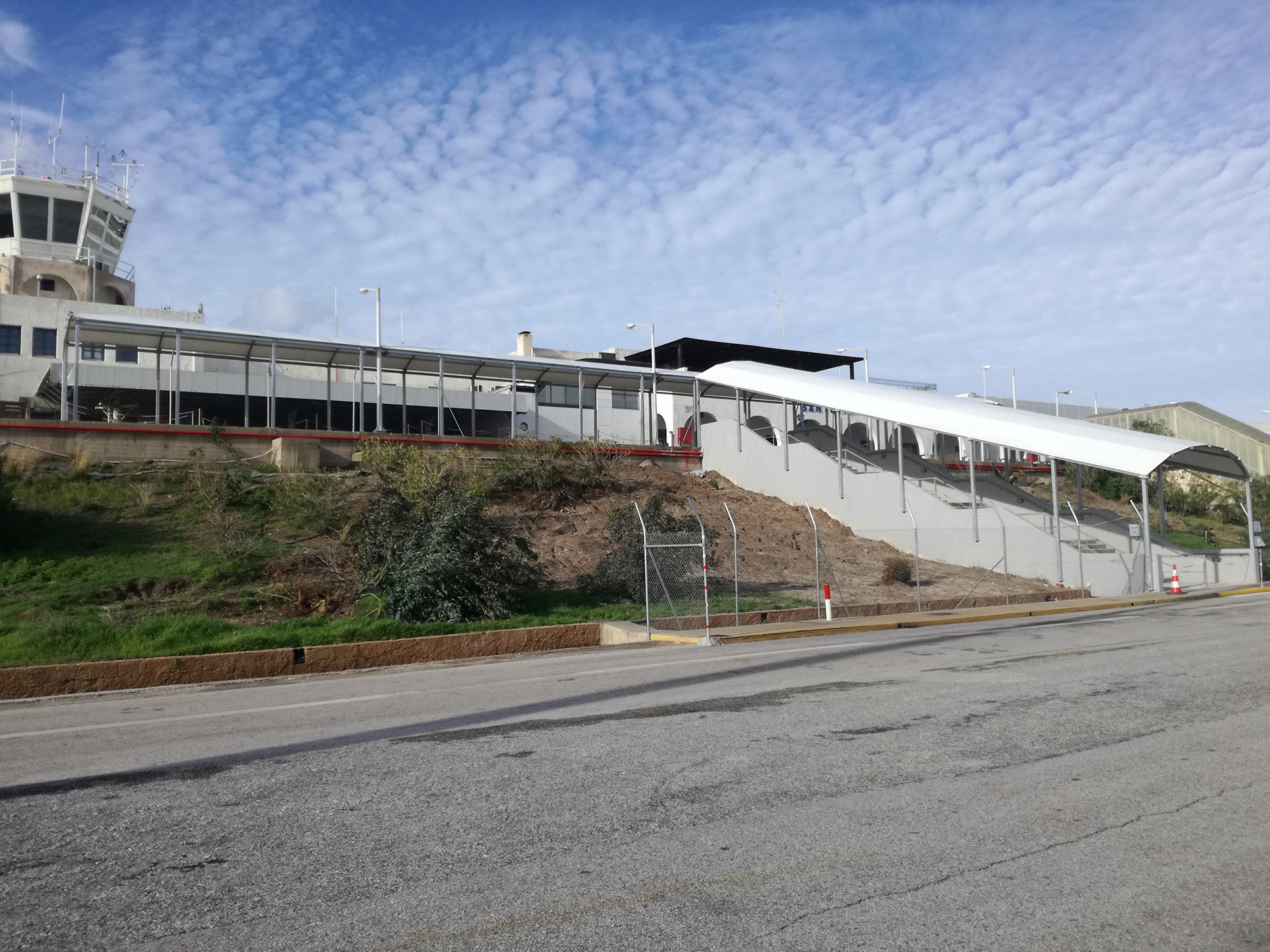 Κατασκευή και τοποθέτηση μεταλλικού υπόστεγου με τέντα για τη σκίαση και προστασία από τη βροχή στον υπαίθριο χώρο του αερολιμένα.