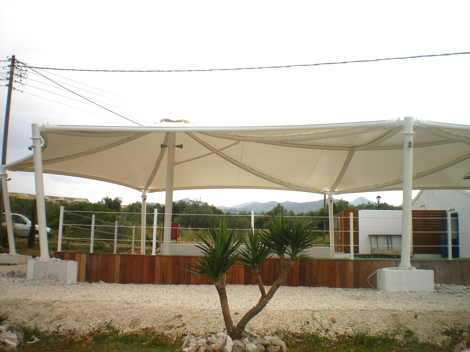 Σταθερό στέγαστρο συναρμολογούμενο και κατασκευασμένο βάση αρχιτεκτονικής μελέτης σε ξενοδοχείο της Ρόδου. Η διάστασή του είναι 25x15 μέτρα και ο σκοπός του είναι να στεγάσει το εστιατόριο και το καφέ του ξενοδοχείου.