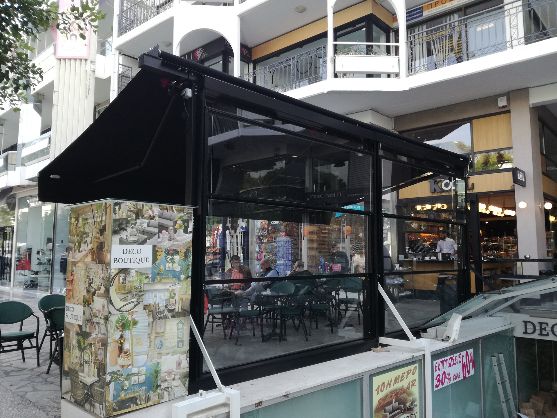 Η τέντα διαθέτει εντυπωσιακή φωτιζόμενη γλώσσα - επιγραφή για την καλύτερη προβολή της καφετέριας. Επιπρόσθετα οι ηλεκτρικά κινούμενοι ανεμοφράκτες τύπου «καρμανιόλα» παρέχουν προστασία του υπαίθριου χώρου από τον αέρα και την πλάγια βροχή.
